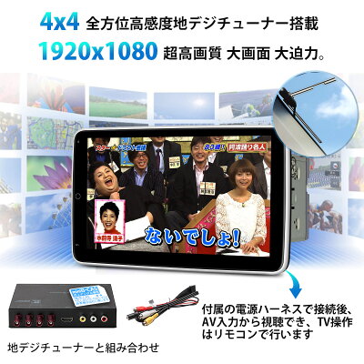 モニターが横も縦も表示可能 * 強力な8コア+4GB RAM+ 64GB ROM + 64ビットプロセッサ * マルチウインドウ表示対応 画面に2つのアプリを走らせる * 10.1インチ大画面 1024*600超高画質 1080P映像対応 * モニター角度40度まで傾ける、横旋回最大40度までさらに5cm範囲内モニターの垂直移動も可能 *4x4全方位高感度地デジチューナー搭載 * Android以外の機能も豊富! OBD2・スクリーンミラーリング・ブルートゥース・ラジオ
